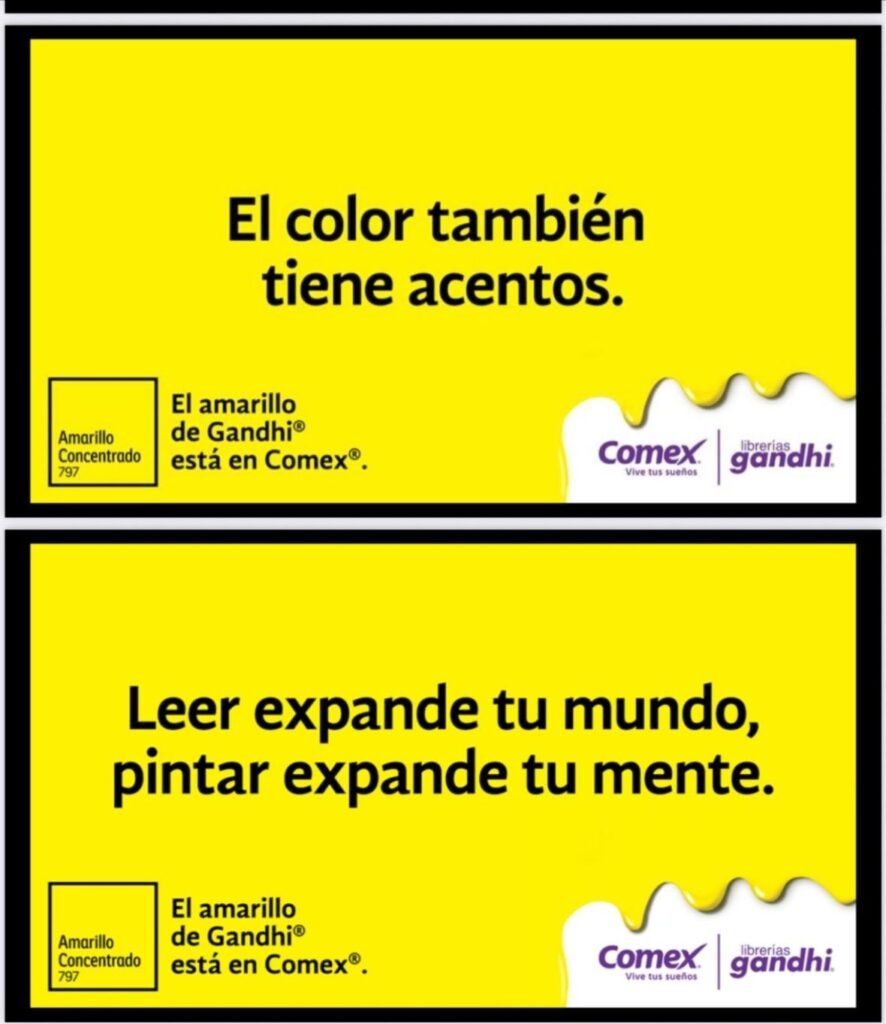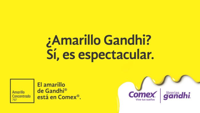 La campaña “El color para leer” de Gandhi y Comex estará visible a través de medios exteriores de gran alcance (Out Of Home), entre ellos carteleras, túneles, aeropuertos y materiales POP en punto de venta, con frases como “La CDMX se pintó de amarillo” “Este amarillo se ve desde el cielo”, “Sigue el Color Amarillo” y “Lee de ida y vuelta”. El objetivo es sorprender a los transeúntes con frases que provoquen una sonrisa, despierten curiosidad y motiven a descubrir tanto un nuevo libro como un nuevo color para transformar sus espacios y vivir sus sueños.