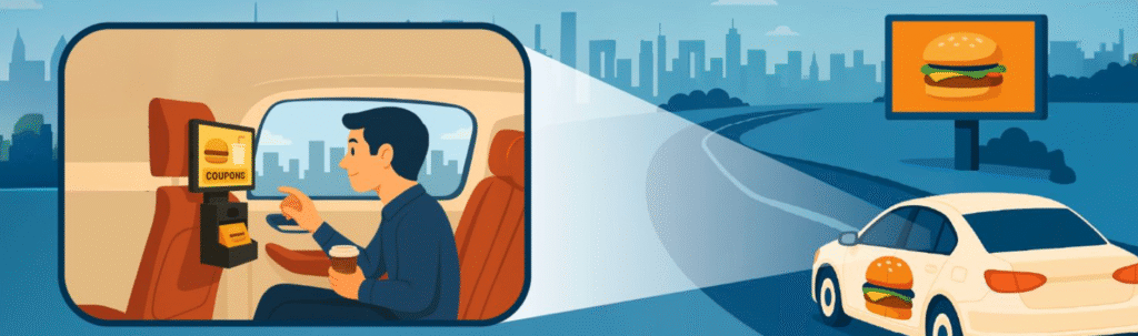 Gracias a que la plataforma de OLA Media se ubica dentro de los vehículos de rideshare y tiene capacidades de segmentación geolocalizada, una campaña puede activarse en las pantallas ubicadas en el asiento trasero de estos vehículos cuando se desplazan en un radio de hasta 200 metros de sus puntos Out-Of-Home tradicionales (espectaculares, vallas, mupis, etc.).